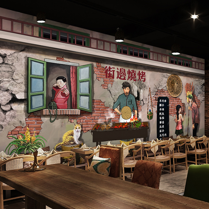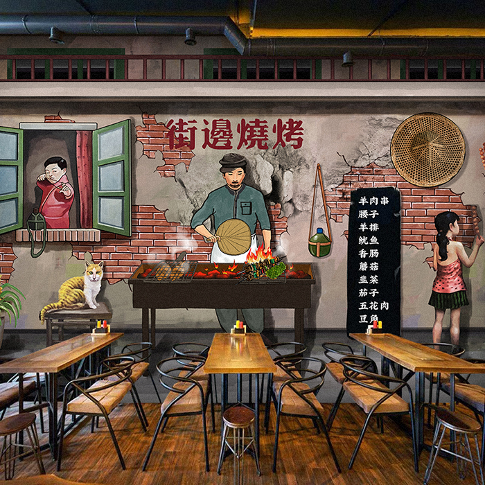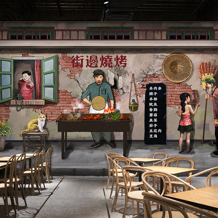 3D复古怀旧个性烧烤撸串烧烤店餐厅饭店串串马路边墙绘